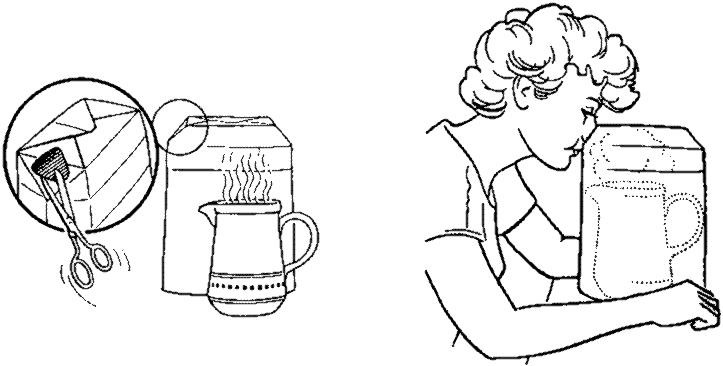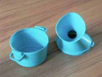 Eine Dampfanwendung kann auch auf kleineren Arealen gemacht werden. Dazu schneidet man aus einer stabilen Papiertüte – auch eine sauber ausgewaschene Milch- oder Saftverpackung lässt sich dazu verwenden – eine Ecke heraus und stülpt sie über einen Krug mit der heissen Flüssigkeit. Weil solches im Bedarfsfall vielleicht nicht immer zur Hand ist, kann man sich auch beizeiten im Fachhandel eine Nasendampfschale (Bild rechts) besorgen.