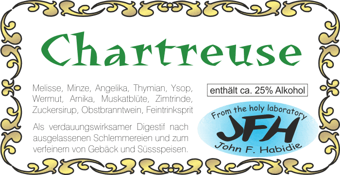 Im Original ein feiner, aber leider viel zu süsser Liqueur nach einer alten Kloster-Rezeptur. Ich habe eine ebenfalls überlieferte Rezeptur leicht abgeändert. Enthält die Auszüge von Melisse, Minze, Angelika, Thymian, Ysop, Wermut, Arnika, Muskatblüte und Zimtrinde.