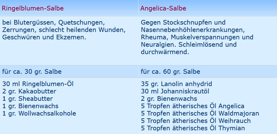 Salben werden normalerweise ohne oder mit sehr wenig Wasseranteil hergestellt. Sie sind sparsam anzuwenden, fetten stark und sind somit im Gebrauch ein wenig eingeschränkt. Salben sind eher Heilmittel als Kosmetika. Die folgenden Rezepturen ergeben stabile, ohne Konservierungsmittel haltbare Salben, die sehr ergiebig sind.