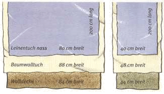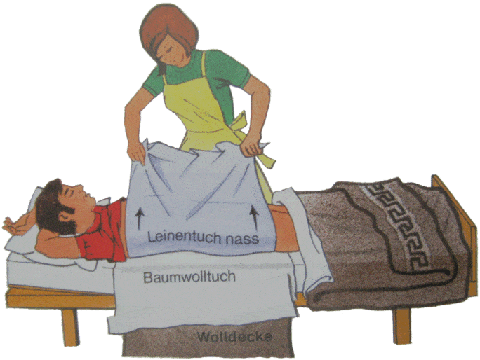 Das Leinentuch wird in frisches, kaltes Wasser getaucht, gut ausgewrungen und direkt satt auf den warmen Körper gebracht. Darauf wird – damit sich der Wickel nicht löst, in der Gegenrichtung – das Baumwolltuch aufgebracht und darüber – wieder in der Gegenrichtung – das Wolltuch.